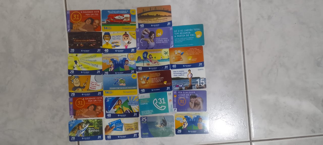 Vendo lote com 23 cartões telefônicos antigos, ideais para colecionadores ou decoração retrô.