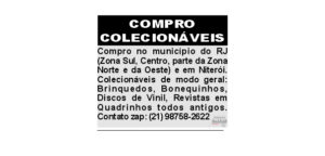 COMPRO COLECIONÁVEIS no município do RJ (Zona Sul, Centro, parte da Zona Norte e da Oeste) e em Niterói. Colecionáveis de modo geral: BRINQUEDOS, BONEQUINHOS, DISCO DE VINIL, REVISTAS EM QUADRINHOS todos antigos. Contato zap: (21) 98758-2622